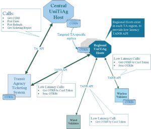 - TANBA Transit Agency API that gives access to a Transit Agency Ticketing System to its targeted OTRB data replica at the Regional UniTiAg Host. More APIApplication Programming Interface More is supported by Regional UniTiAgUniversal Ticketing Agent is a model of open-loop public transit ticketing using card-not-present transactions for fare acquiring. More Hosts located in specific geographical regions where TAsA transit operator or an agency representing several transit operators. The TA acts as a merchant from the UniTiAg’s standpoint. More operate. These hosts maintain targeted replicas of TA-specific OTRBOpen-to-Ride Balance is an e-wallet monetary value for ticketing purposes, associated with a contactless token, shared between Transit Agencies. It can be pre-authorized, prepaid, postpaid, or a combination of thereof. More data for each TAA transit operator or an agency representing several transit operators. The TA acts as a merchant from the UniTiAg’s standpoint. More in this region. This reduces latency for TANBA Transit Agency API that gives access to a Transit Agency Ticketing System to its targeted OTRB data replica at the Regional UniTiAg Host. More APIApplication Programming Interface More calls by ensuring faster access within the region.
